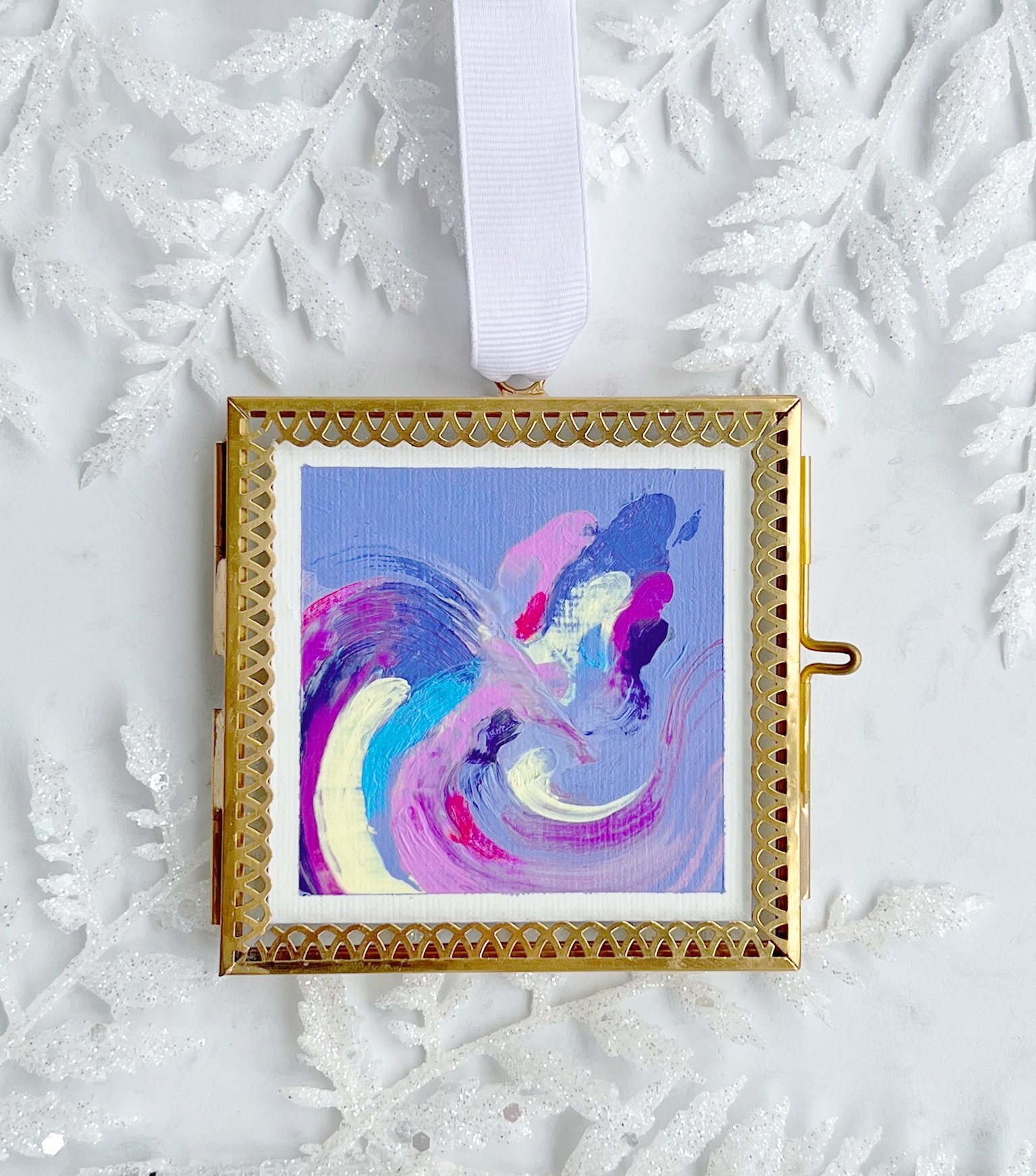 Original acrylic painting on paper in a laced edge, hanging photo frame. Can be hung on a wall year round or hung from a tree as an ornament.